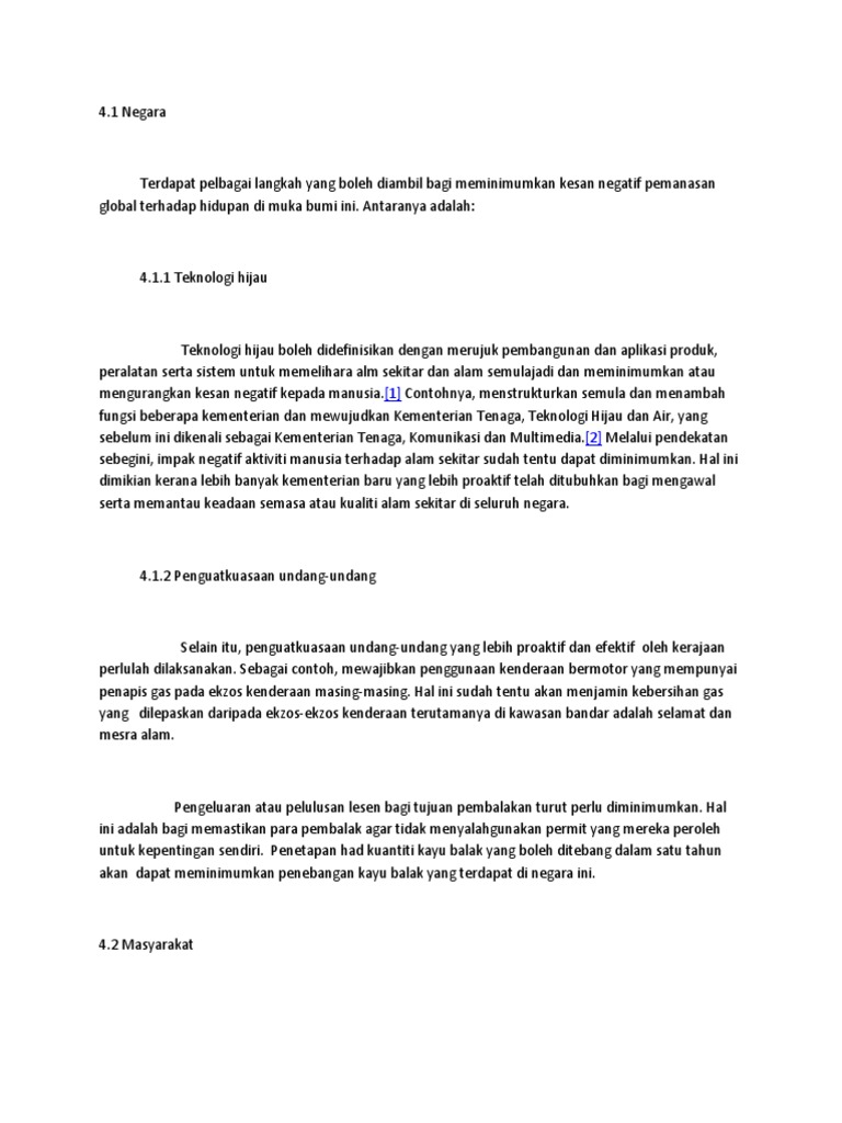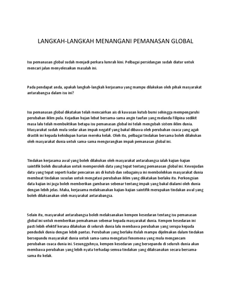 Langkah Mengatasi Pemanasan Global Karangan Spm from demo.vdocuments.mx Kami mengetahui bahawa kesan yang didatangkan daripada kejadian pemanasan global amat menakutkan. Pemanasan global atau dalam bahasa inggris dikenal sebagai global warming memang cukup menyita perhatian belakangan ini. Yuk langsung kita simak artikel mengenai. Isu pemanasan global sudah menjadi perkara lumrah kini. Penanaman tumbuhan hijau adalah bertujuan untuk menngkatkan penghasilan gas gas yang bersih dalam udara. Dan bahkan dari sebuah penelitian tentang bumi ini, akibat pemanasan global atau global warming ini membuat suhu pada bumi ini mengalami. Contohnya, isu pemanasan global yang semakin serius pada masa kini. Pelbagai persidangan sudah diatur untuk mencari jalan menyelesaikan masalah ini.